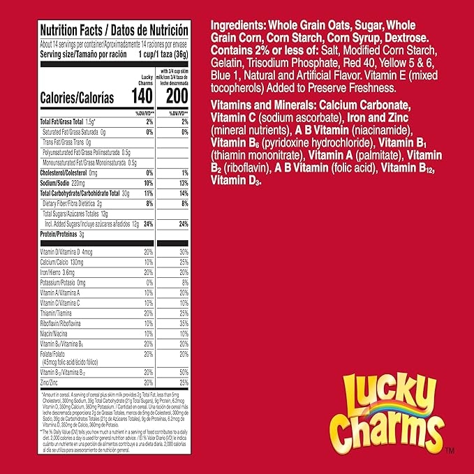 Lleva a tu mesa la magia del desayuno americano más icónico con Lucky Charms. Este no es solo un cereal; es una experiencia llena de color y sabor que ha cautivado a generaciones. Su combinación de avena tostada y dulces malvaviscos convierte cada mañana en un momento divertido y delicioso, ideal tanto para los más pequeños como para los adultos nostálgicos.